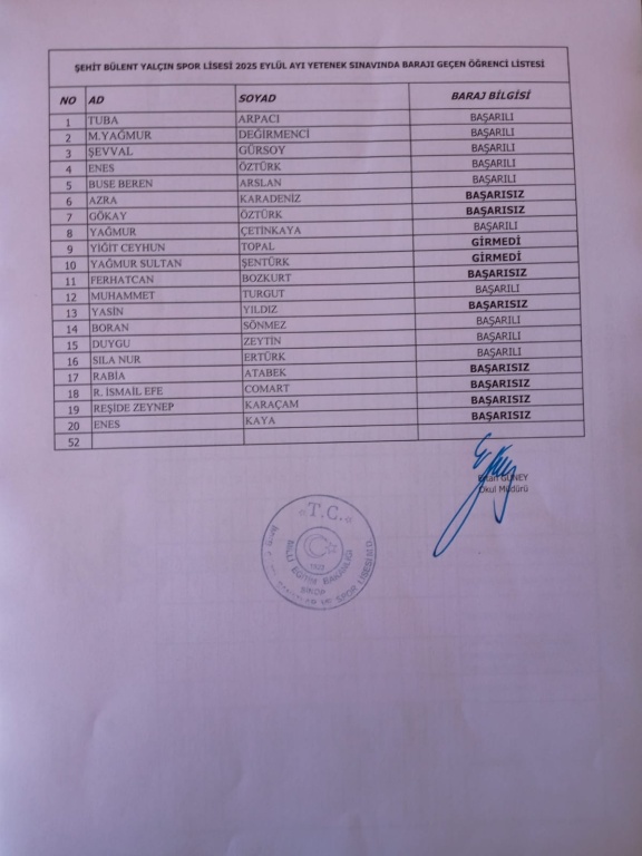 Yetenek sınav sonucu BAŞARILI olanların;